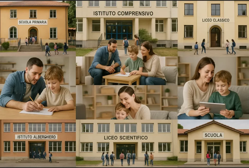 foto divisa in 8 parti, con genitori in congedo parentale e varie scuole